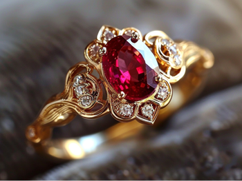情熱と華やかさを象徴するリングです。鮮やかで深みのあるルビーを中央にあしらい、ゴールドの繊細なデザインが優美さを引き立てます。
