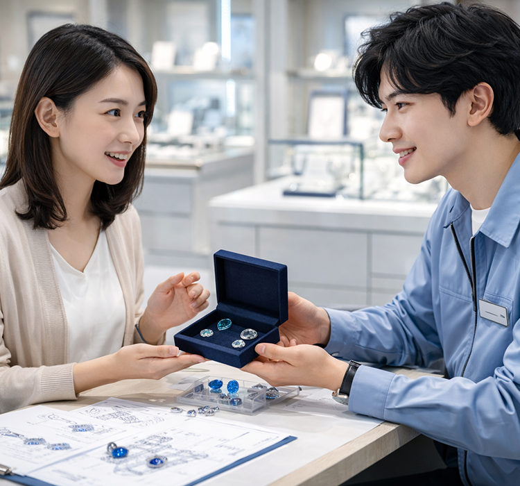 お持ちの宝石やジュエリーの状態、ご希望のデザインやご予算などを 丁寧にヒアリングさせていただきます。